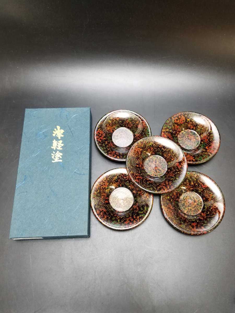 - 【未使用】津軽塗 唐塗 茶托揃 4.3寸 幅約13cm 5枚セット 煎茶道具 漆器 漆芸 天然木 木製