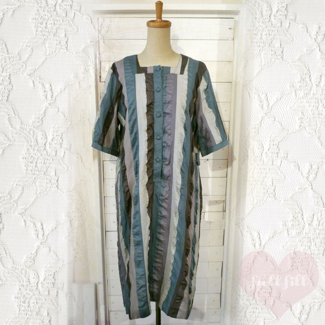 - 古着 ワンピース サマーワンピース ナチュラル ストライプ 昭和古着 昭和レトロ くすみカラー used 半袖 五分袖 おしゃれ ヴィンテージ