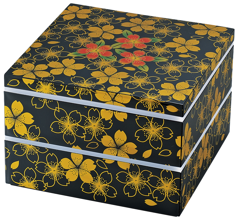 - 《只今!20%値下げ中》濱田屋【創作漆器】7.0角二段オードブル華の舞黒(シール付き)