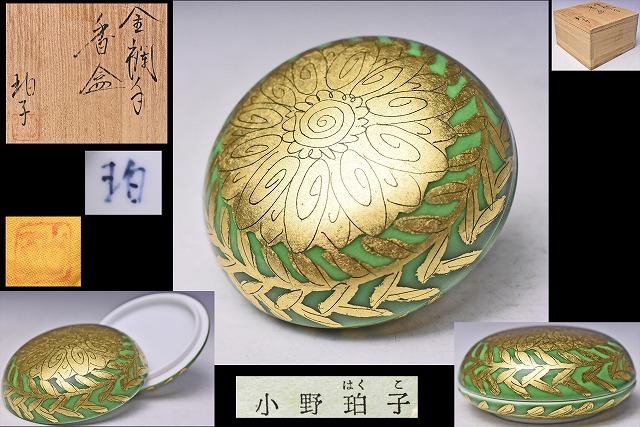 - 小野珀子 ★ 金襴手香合 ★ 共箱共布栞 ★萌黄金彩タイプ ★ 緑色の釉薬の上に金彩 ★ 物故作家 女流作家 ★ 加藤土師萌作品に影響受ける