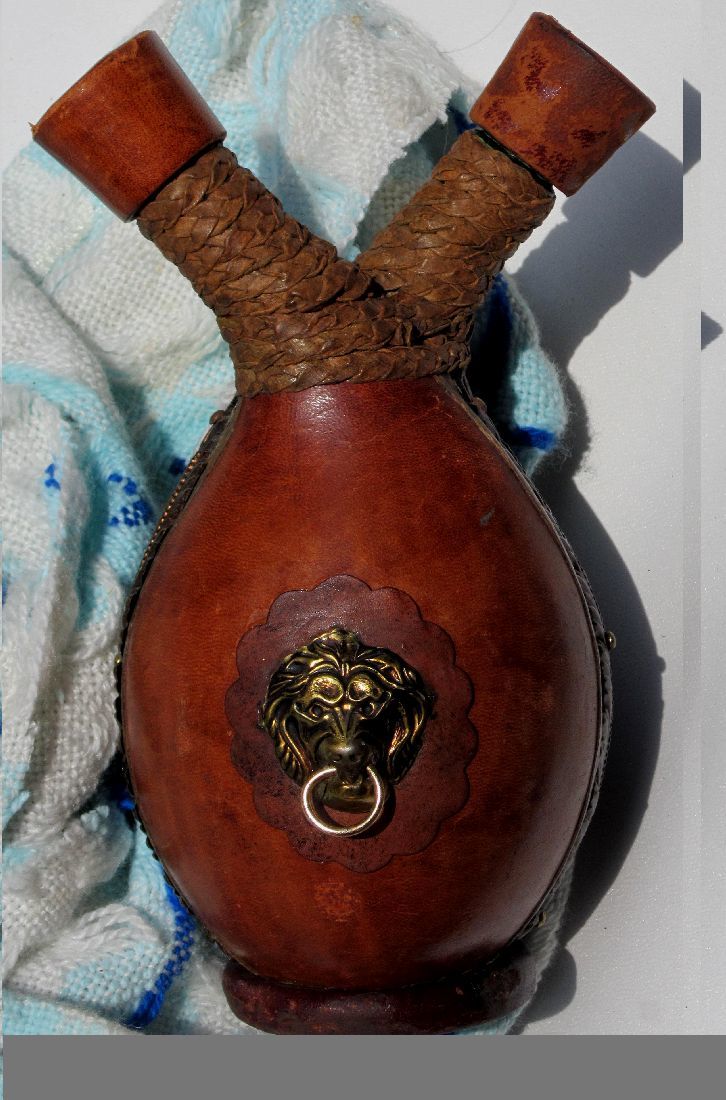 - No144 2つの注口がある水筒 皮張り 内部はガラス イタリア製 イラン 中東