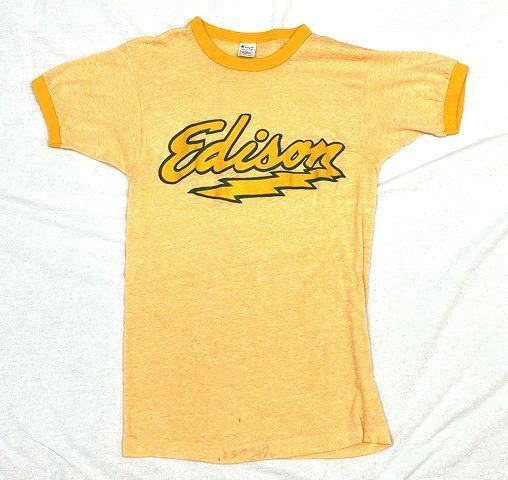 > 80'S アメリカ製 トリコタグ チャンピオン Champion Tシャツ リンガー Edison エジソン イエロー 霜降り サイズM [lo-0017]