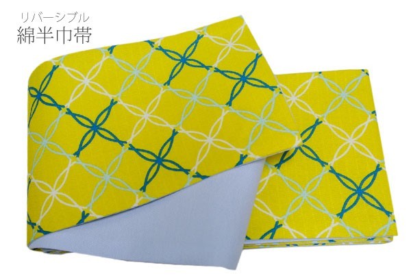 - 綿 半幅帯 浴衣帯 リバーシブル 106 黄色系 変わり七宝 縞 袷帯 ゆかた帯 両面帯 半巾帯 小袋帯 袴下帯