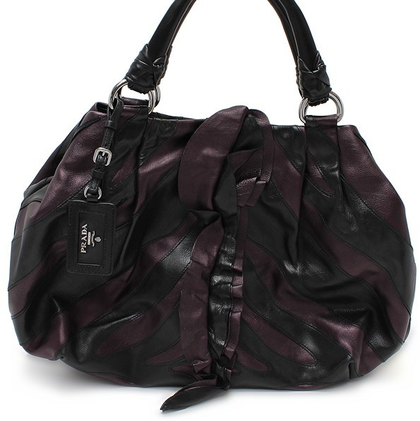 > 新品同様 プラダ VITELLINO MORDO BR3983 レザー ハンドバッグ パープル&ブラック PRADA