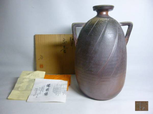 - 旧家から 備前焼 柴岡守「備前 扁壷」共箱 栞付/日本工芸会会員