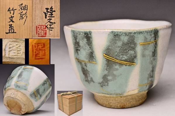 - 古川隆久 ★ 釉彩竹文ぐい呑 ★ 共箱共布 ★ 金彩で節目 ★ 検画家釉下彩