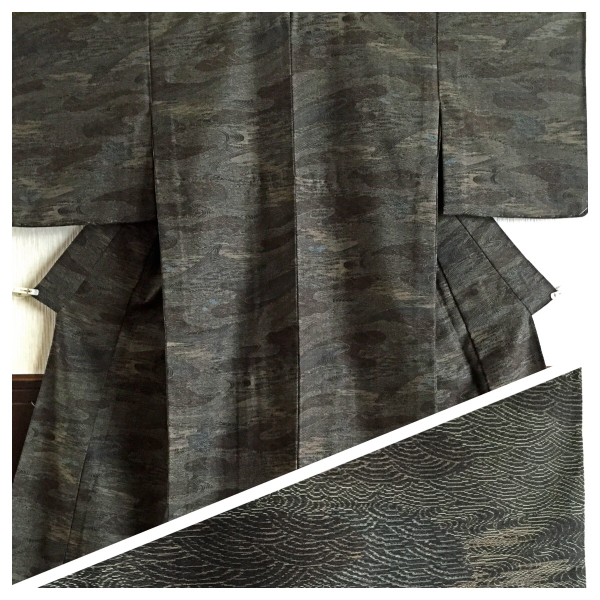 - 【単衣】ウール着物 身丈140cm 流水柄 躾有り 100604