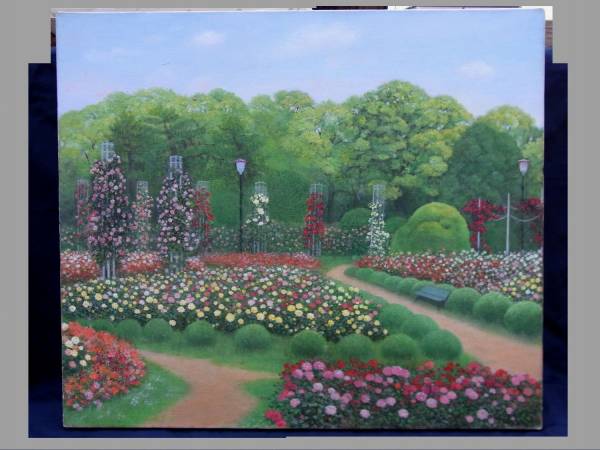 - No207【真作】F8号油絵 麻丘 千晴「薔薇園風景」名古屋 鶴舞公園内