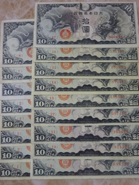 - ★ 日華事変軍票 戊号10円 上美品 記号 1~17番 17枚セット ★ No.365