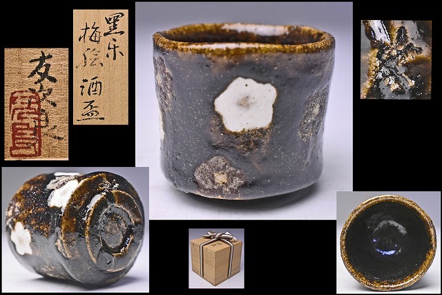 - 直木友次良 ★ 黒楽 梅之絵 ぐい呑 ★ 共箱 ★ 希少 ★ 検 直木美佐 江川拙斎