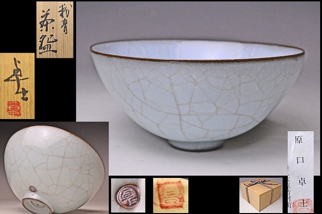 - 原口卓士 ★ 粉青 茶碗 ★ 共箱 共布 栞 ★ 京焼 ★人気作家 ★ 南宋官窯風 ★