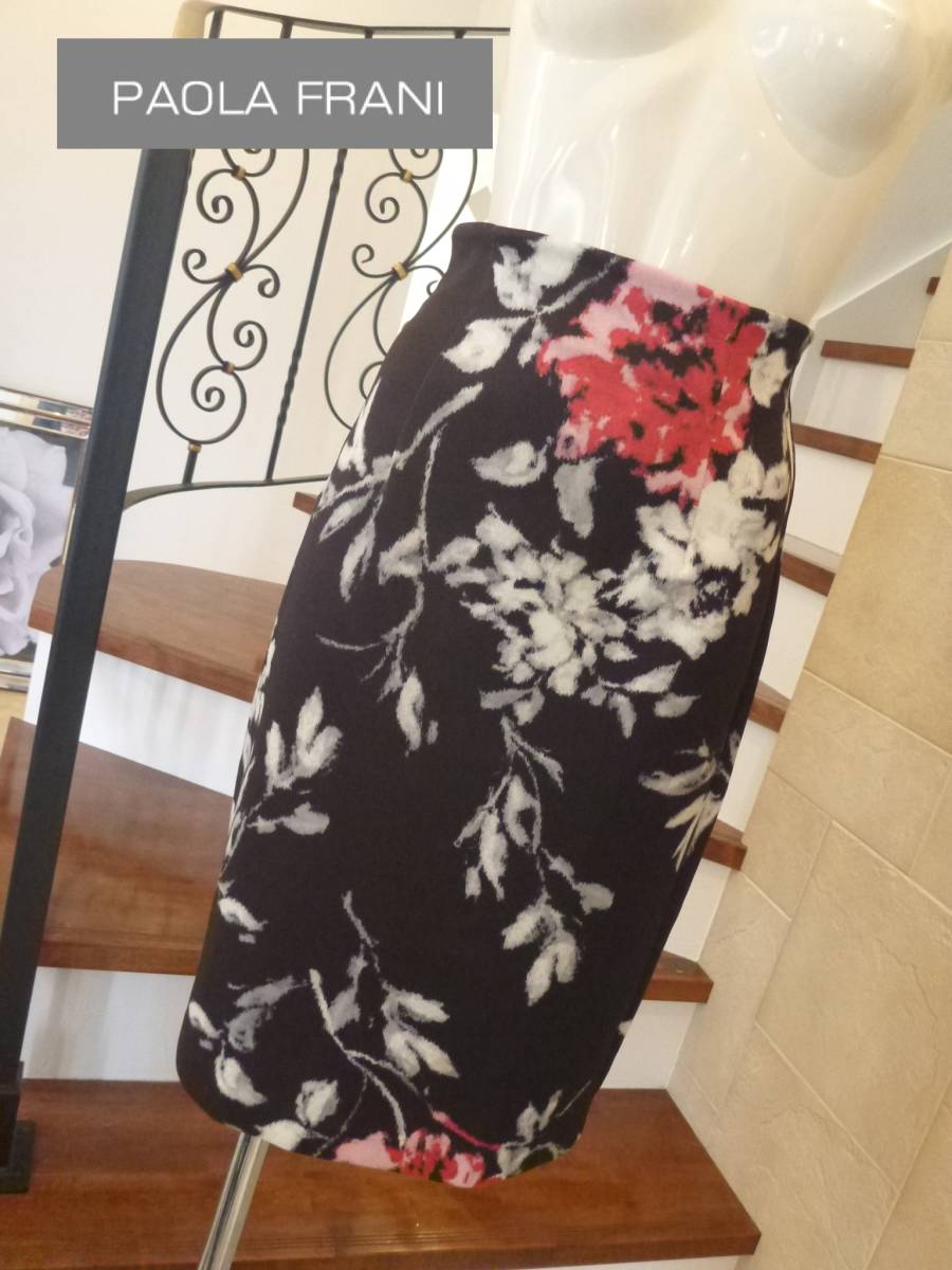 - 美品 PAOLA FRANI パオラフラーニ ★黒 ピンク 白 花柄 ハイウエストスカート 38 S相当