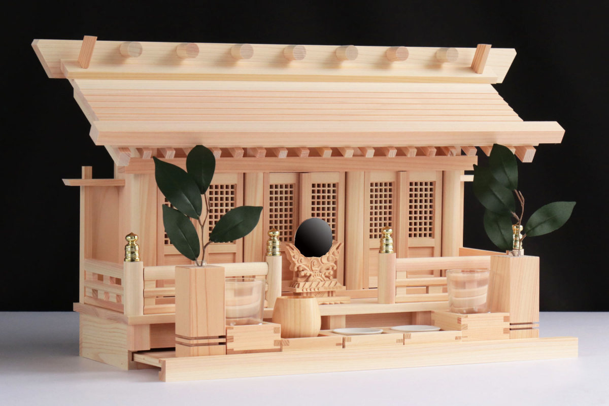 - 神棚 壁掛け モダン 三社■ 通し屋根 格子扉 オーダー金具 ■ 白木桧神具セット付属