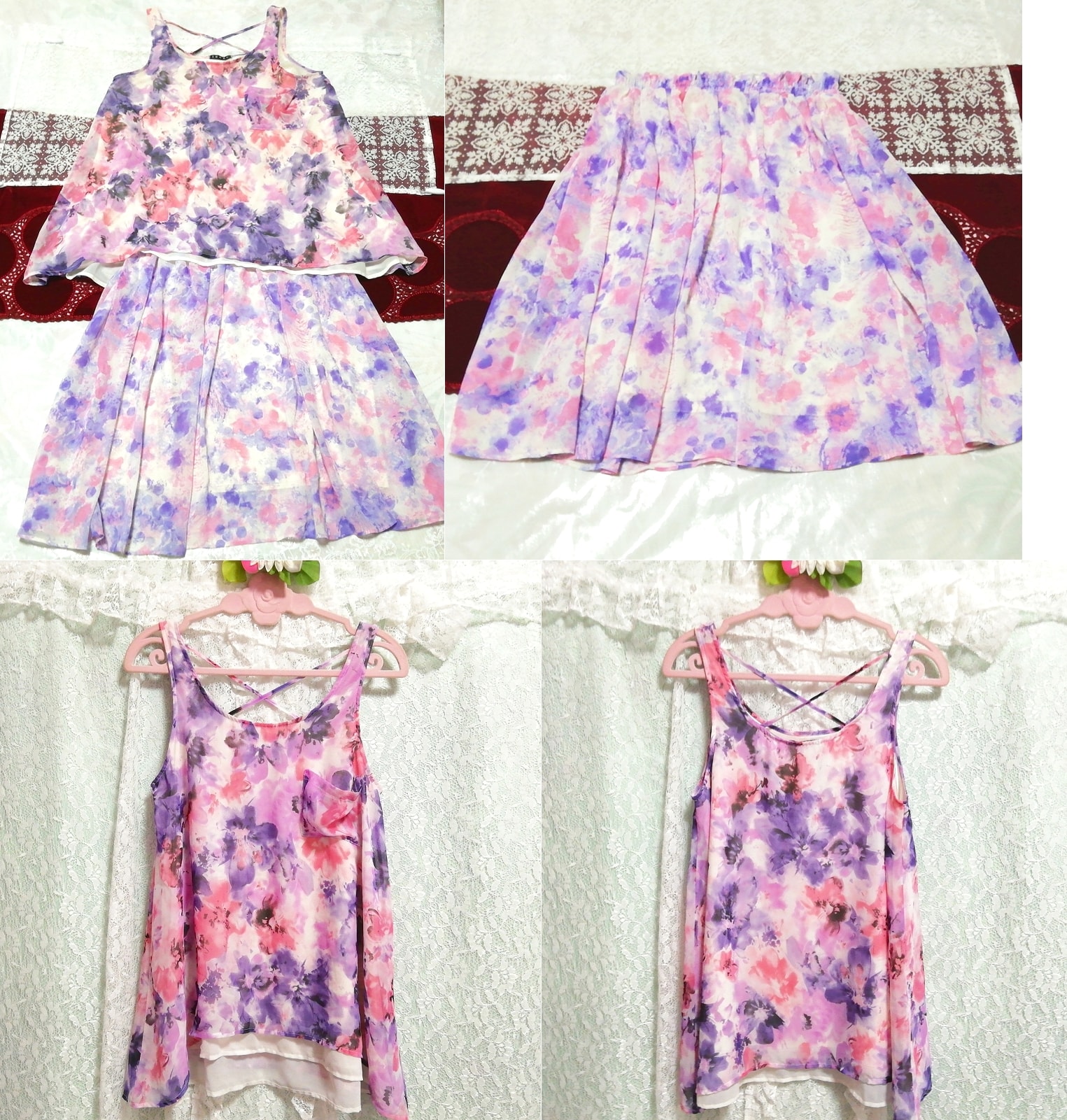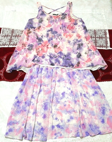 - 白紫ピンクシフォンノースリーブチュニック ネグリジェ 水彩柄フレアスカート 2P White purple pink chiffon tunic negligee flare skirt