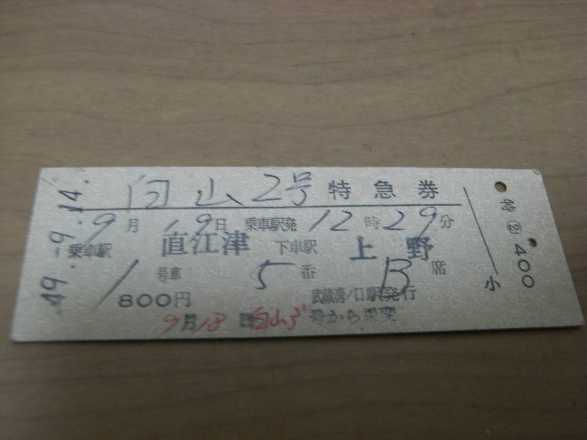 - 白山2号 特急券 昭和49年9月14日 武蔵溝ノ口駅発行