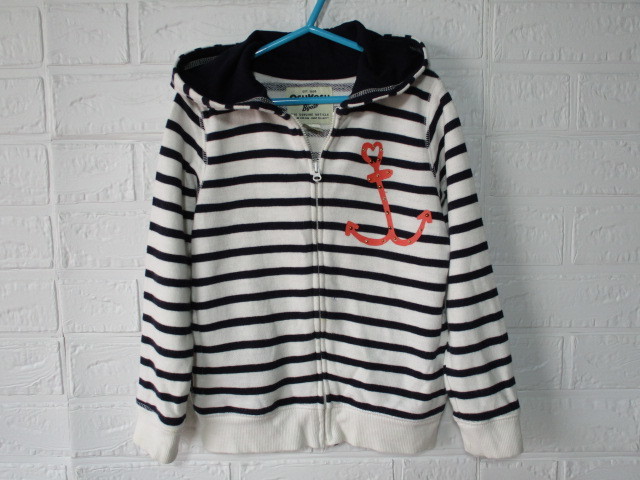 - キッズ OSHKOSH マリンボーダー 可愛い 裏毛スウェット ジップパーカ 白紺 110
