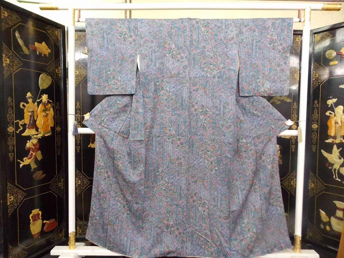 - きもの今昔2986 正絹小紋袷きもの グレーブルー基調の更紗柄 しみ汚れなし