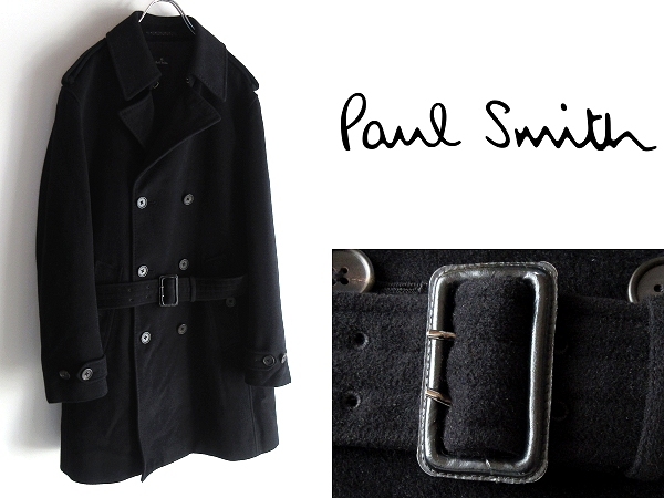 > 高級 PS Paul Smith ポールスミス ベルト付 アンゴラ/ウール/カシミヤビーバー ロング トレンチコート ダブルコート L 黒 ブラック 日本製