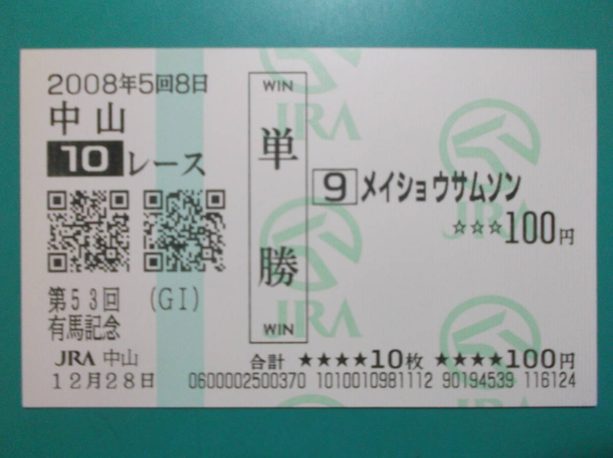 > メイショウサムソン (引退レース)第53回有馬記念(GI) 単勝100円 ハズレ馬券 2008年5回8日 中山10R9番 12月28日