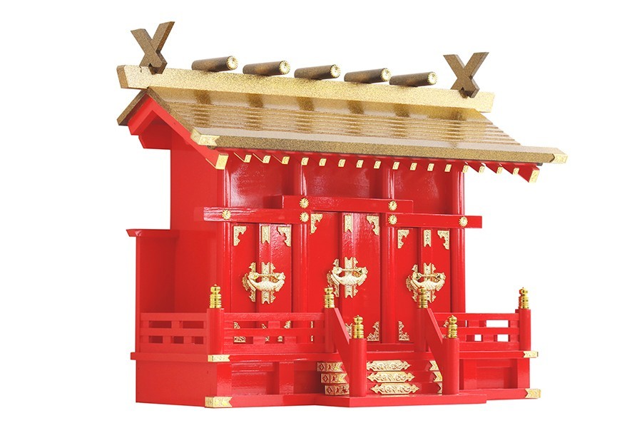 - 黄金屋根の稲荷宮 神棚 ■ 特上 重ね塗り■ 通し屋根 三社 ■ 商売繁盛 開運祈願 きつね