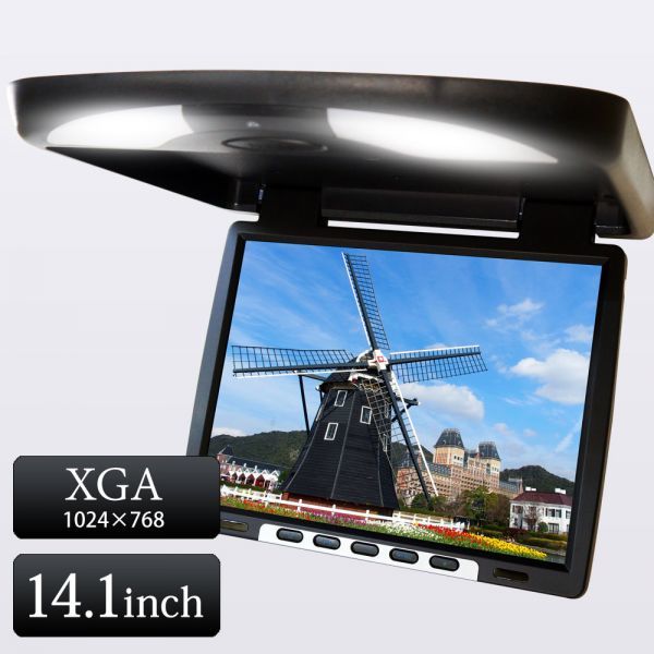 - IRトランスミッター内蔵 フリップダウンモニター ブラック 14.1インチ 解像度:1024x768 高画質 LEDルームライト 液晶モニター 1年保証