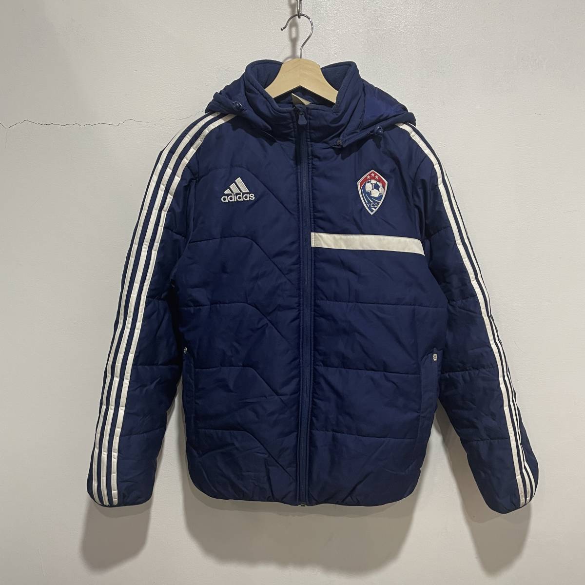 > ☆送料無料☆adidas☆中綿ダウンパーカー☆3本ライン☆ブルゾン☆YESsoccer☆M☆ブルー系☆F20c
