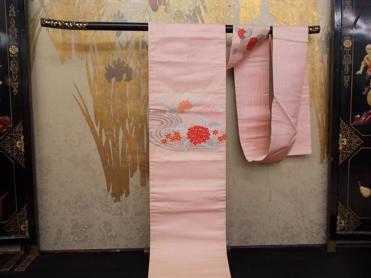 - きもの今昔3284 夏の100円バーゲン 名古屋帯 西陣織九寸名古屋 淡いピンク色地 太鼓と前腹に紫陽花の柄