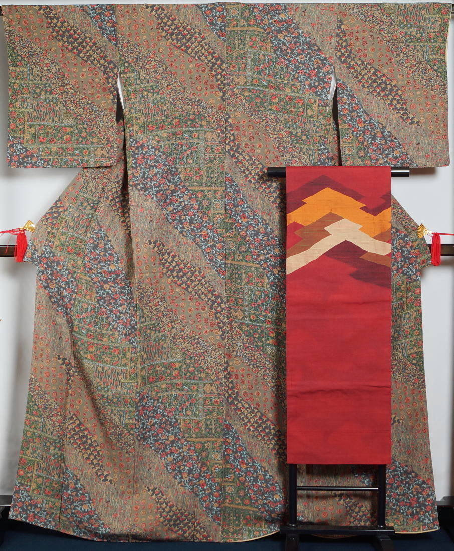 - 着物セット 小紋・名古屋帯 2点 セット 更紗模様 裄長・トールサイズ 小紋 名古屋帯 着物 セット 正絹 中古 リサイクル着物 京都きもの天陽
