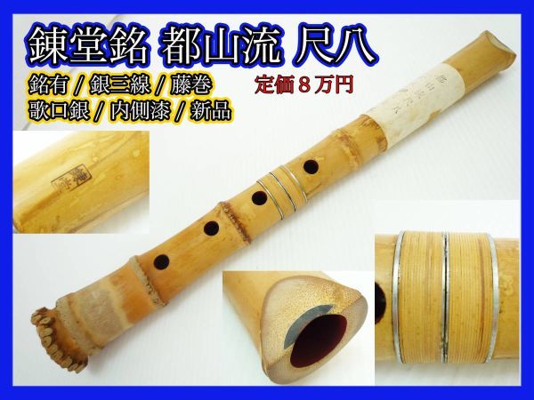 - 新品未使用 錬堂 銘有 銀三線 藤巻 歌口銀 都山流尺八 藤巻 中継ぎ 在銘 一尺四寸菅 約42cm 定価8万円 竹製 内側漆 狂言雅楽能和楽器 _K6