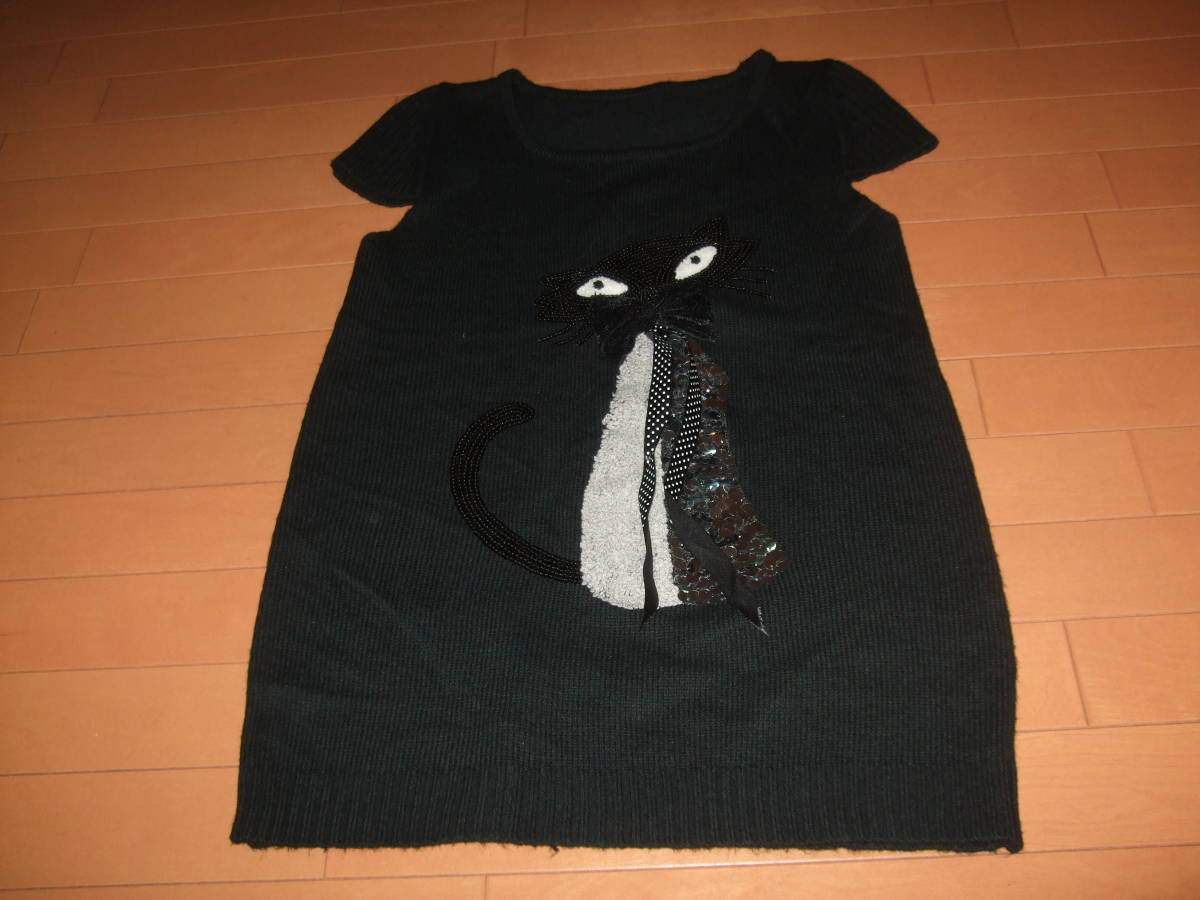 - 良品即決☆猫スパンコール刺繍アップリケ チュニックニットベスト☆ブラック