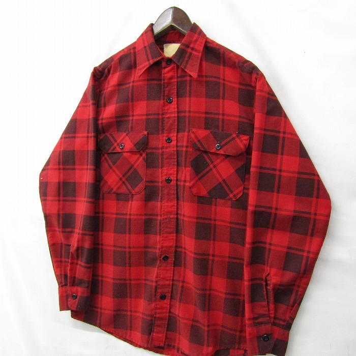 > 70s 80s Vintage ビッグ サイズ XL~ ネル シャツ 長袖 チェック 襟芯 フラップポケット レッド 古着 ビンテージ 1MA0403