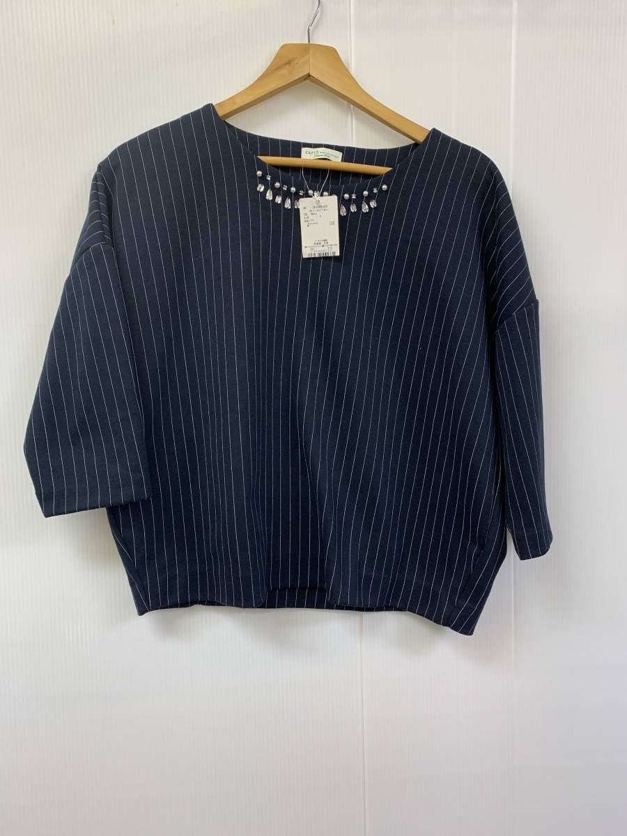 - x859★earth music&ecology タグ付き六~七分袖衿ビジューストライププルオーバー ネイビー サイズF★春
