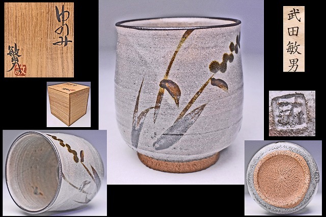> 武田敏男 ★ 湯呑 ★ 共箱 栞 ★ 師: 人間国宝 田村耕一 / 薫陶: 北出塔次郎 ★ 民芸陶らしい力強い造形と絵付の逸品 ★ 稲穂 ★