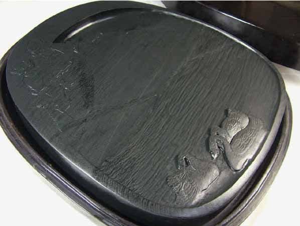 - ##■龍香堂■ 歙洲石(きゅうじゅうせき)龍尾眉子紋硯龍尾硯 眉子紋「春暖先鴨知」280mm△▼