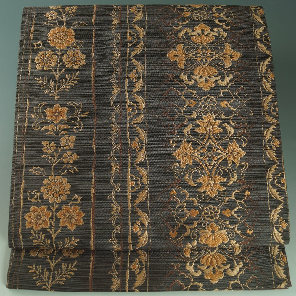 - 袋帯 未使用品 西陣 更紗・華文模様 野蚕糸織 六通柄 鉄黒・黒色系 中古 女性和服 仕立て上がり リサイクル着物 帯 京都きもの天陽