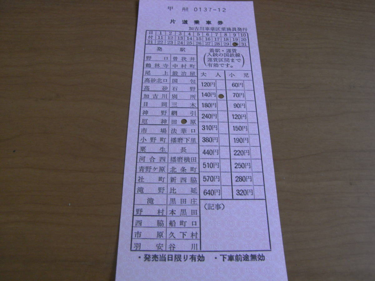 - 片道乗車券 加古川車掌区乗務員発行 (0137-12) ●高砂線・加古川線・鍛冶屋線・三木線・北条線