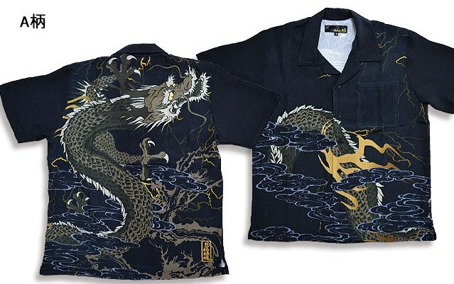 > 闇アロハシャツ◆絡繰魂 A柄XLサイズ 222889 和柄 和風 狼 オオカミ 龍 竜 がしゃどくろ 富士山 ハワイアン