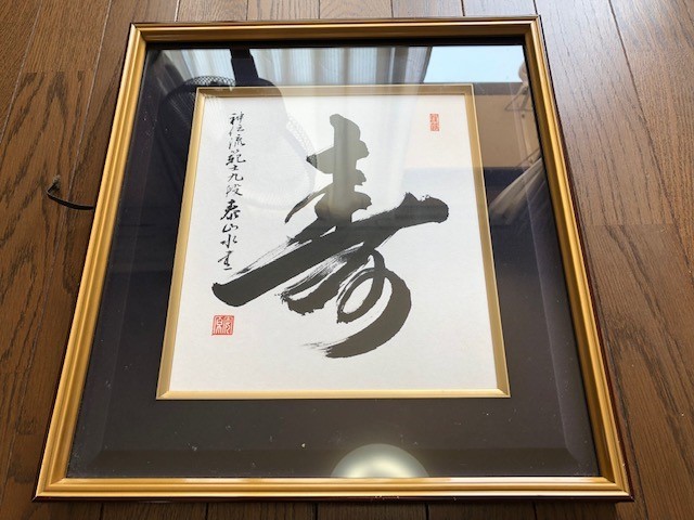 - 寿 毛筆 落款 額入り 横38cm 縦51.3cm 奥行2.9cm 1,364g 神伝流 士九段 泰山水垂? 安原泰 岡山神伝流 送料無料 底値