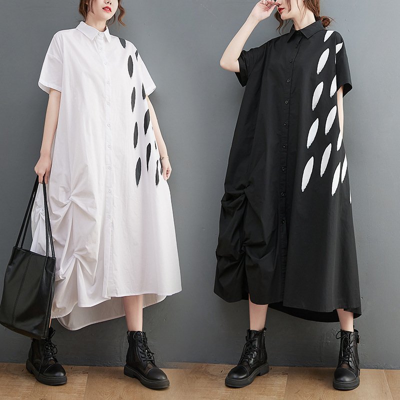 - ZJM975 大きいサイズ☆白地にプリントがおしゃれなロング丈ワンピ ★新品スカートクシュっ清楚系なシャツワンピ