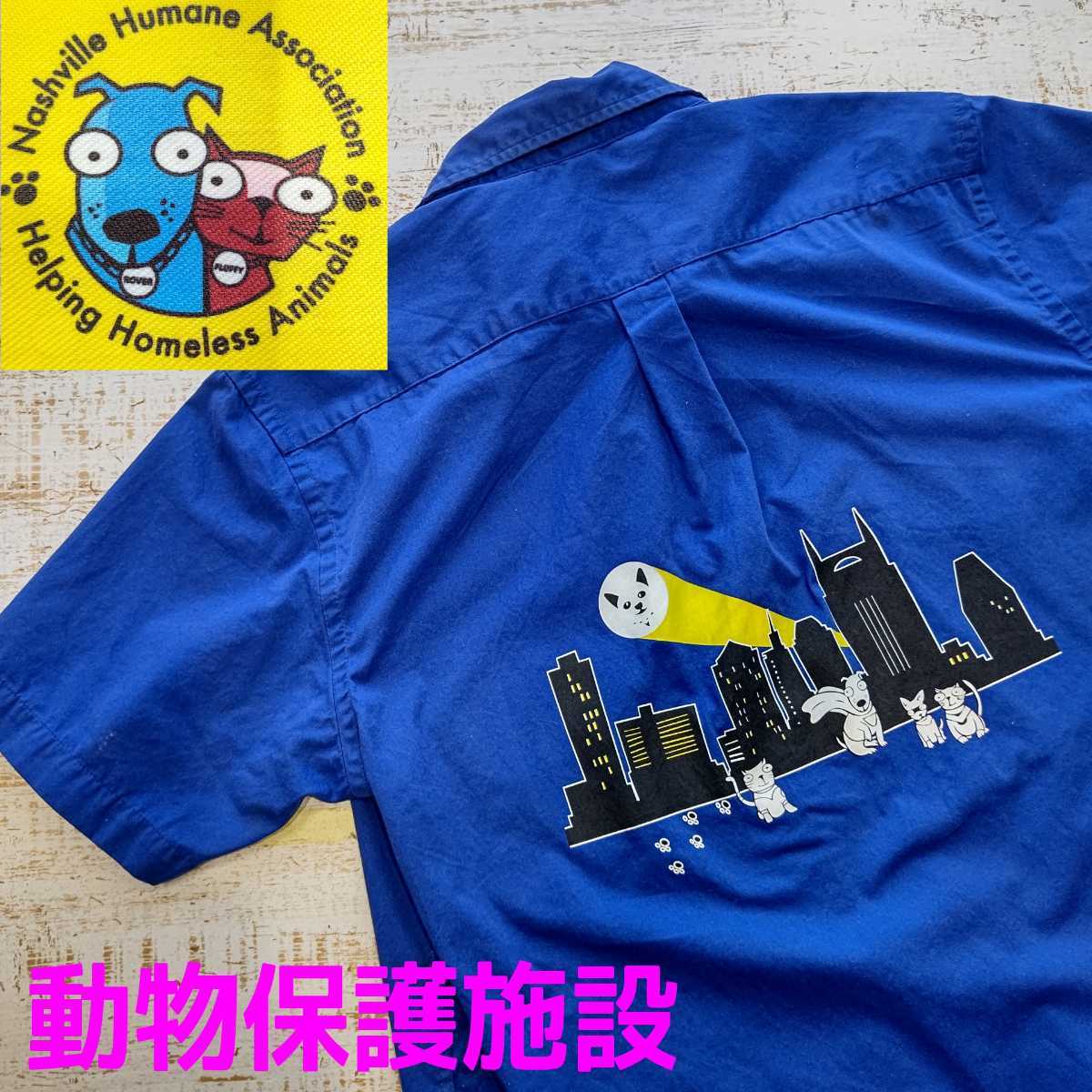 - A632 PORT AUTHORITY シャツ 半袖 アメリカ 古着 M バック プリント 前 刺繍 ワッペン 動物 保護施設 団体 犬 猫 里親 探し ペット ネコ 激