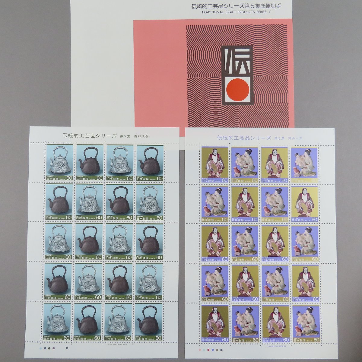 > 【月】美品 額面2400円 伝統的工芸品シリーズ第5集 博多人形、南部鉄器 60円x20枚x2シート 未使用 1985年 郵政省説明書【切手0817】
