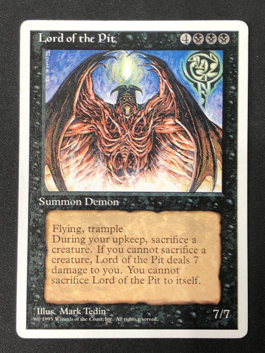 ●Magic: The Gathering【アルターネイト第4版】収録●レアリティ:レア●カード名:奈落の王/Lord of the Pit飛行、トランプルあなたのアップキープの開始時に、奈落の王以外のクリーチャー1体を生け贄に捧げる。それができないなら、奈落の王はあなたに7点のダメージを与える。商品はローダーにお入れした状態で発送致します。ご了承くださいませ。※一部傷み有。あくまでも中古品です、プレイ用とお考え下さい。※画像をご確認の上ご納得して頂けた方のみご入札をお願い致します。※他画像に写しきれないダメージがある可能性がございます、予めご了承下さいませ。※完品、美品をお求めの方は入札をお控えくださいませ。