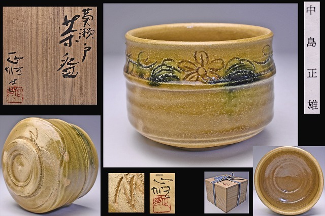 - 中島正雄 ★ 黄瀬戸茶碗 ★ 共箱 共布 栞 ★ 黄瀬戸 ★ 美濃雅山窯 ★ 巨匠 ★ 茶道具 ★