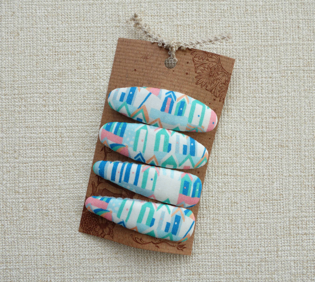 - ★ ハンドメイド リバティプリント使用 おうち柄5㎝パッチンピン ビーチハッツ ブルーグリーン ★