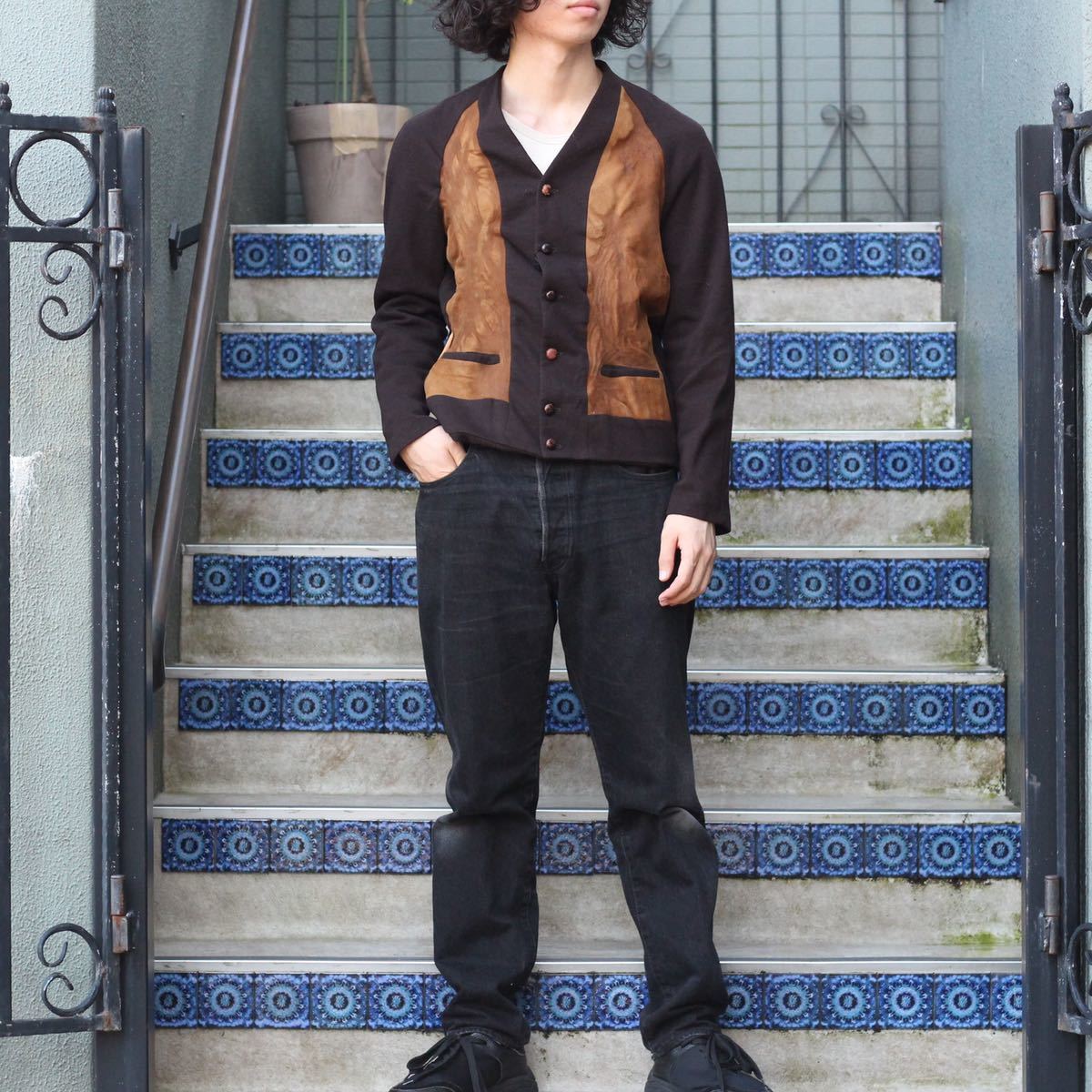- 70's USA VINTAGE DINO LEATHER KNIT CARDIGAN/70年代アメリカ古着レザーニットカーディガン