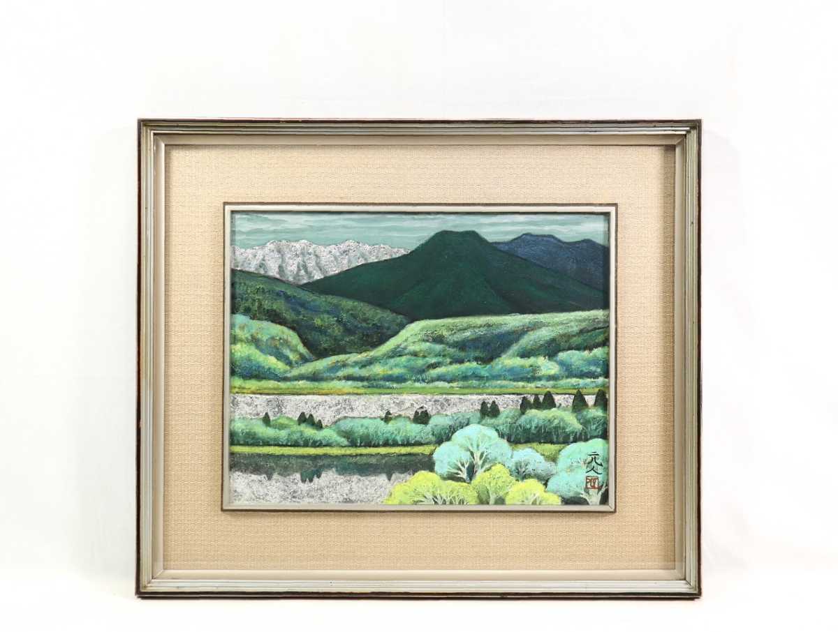 > 真作 杉原元人 日本画「白樺湖」画 41×32cm 6号 三重県出身 日展参与 児玉希望に師事 芯のある力強くも繊細な筆致 静寂感ある山湖図 6726