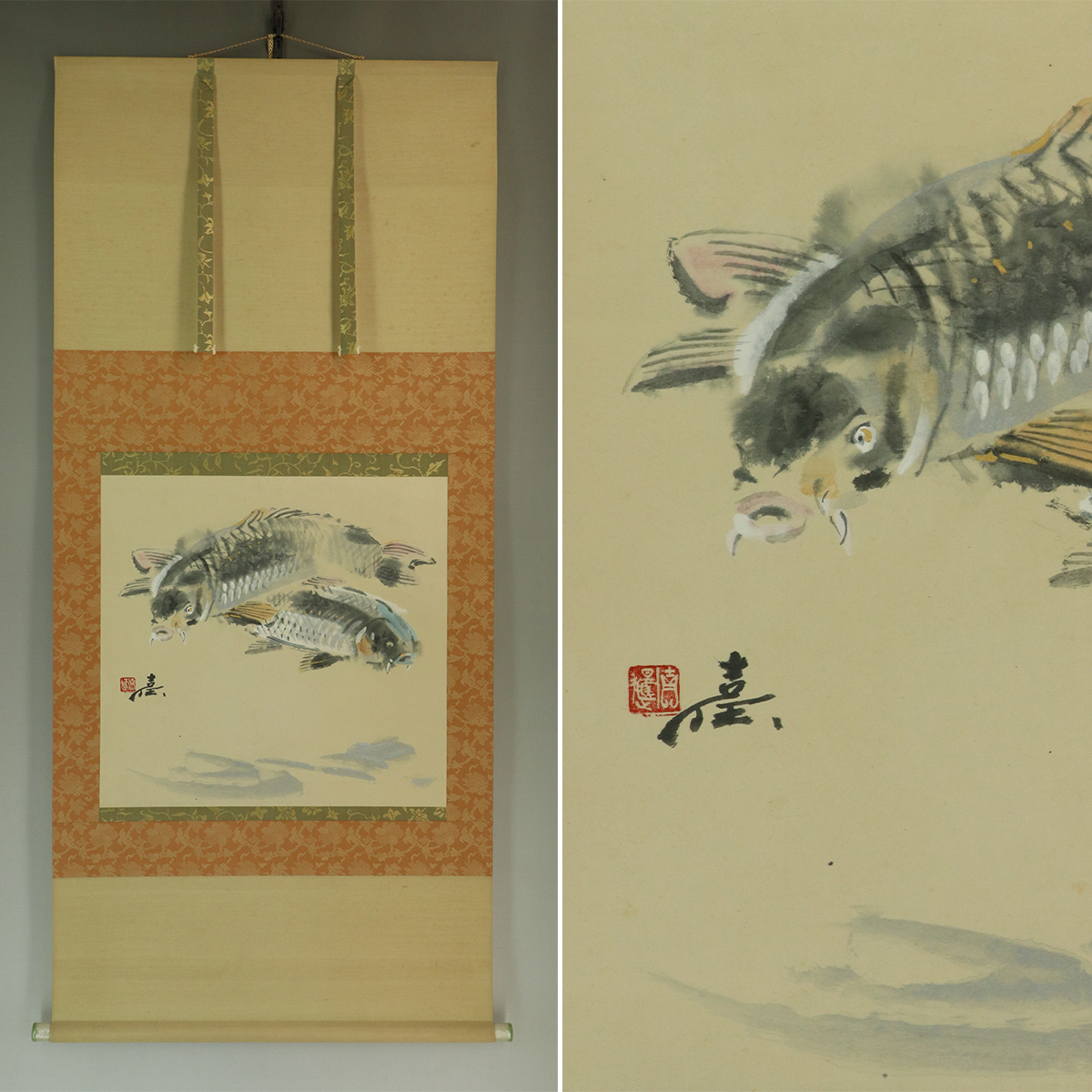 - 【真作】山口吉旺【眞魚】◆紙本◆共箱◆掛軸 u09086