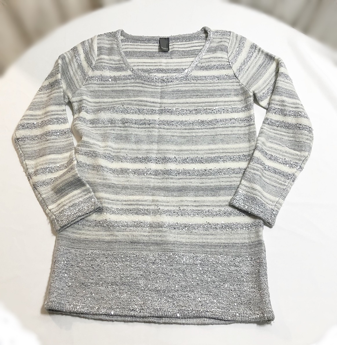 - 送料無料♪ニット セーター ウール混 キラキラスパンコール ランダム ストライプ 丈長め