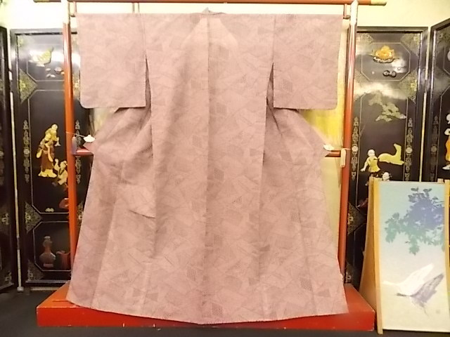 > きもの今昔4522 合繊きもの きめ細かい絽の単衣バチ衿仕立 鳶色(濃い藤色の濁り)鮫小紋調庭垣根柄 身丈160cm