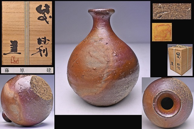 - 藤原建 ★ 備前 徳利 ★ 共箱 共布 栞 ★ 師:北大路魯山人 / 叔父: 人間国宝 藤原啓 ★胡麻と緋襷が楽しめる贅沢な逸品 ★ 酒器